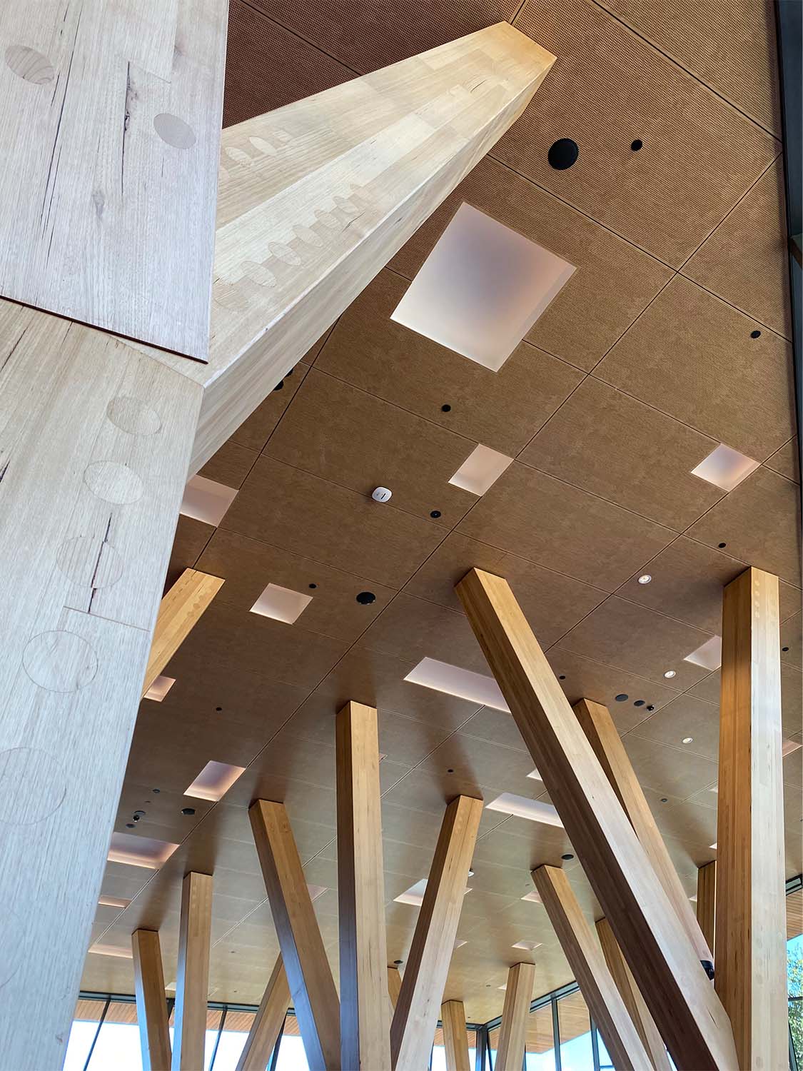 In recognition of the region’s former history of timber manufacturing and large-scale timber structures, the design uses local timber to herald a new era of mass timber construction. The main foyer is the key expression of this idea where a set of tree-like, mass-timber columns support the foyer roof.